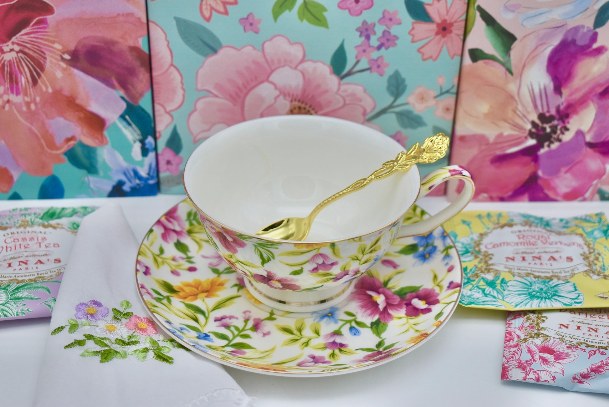 - Set Includes: Cup, Saucer, Teaspoon, Linen Napkin, Tea Packet