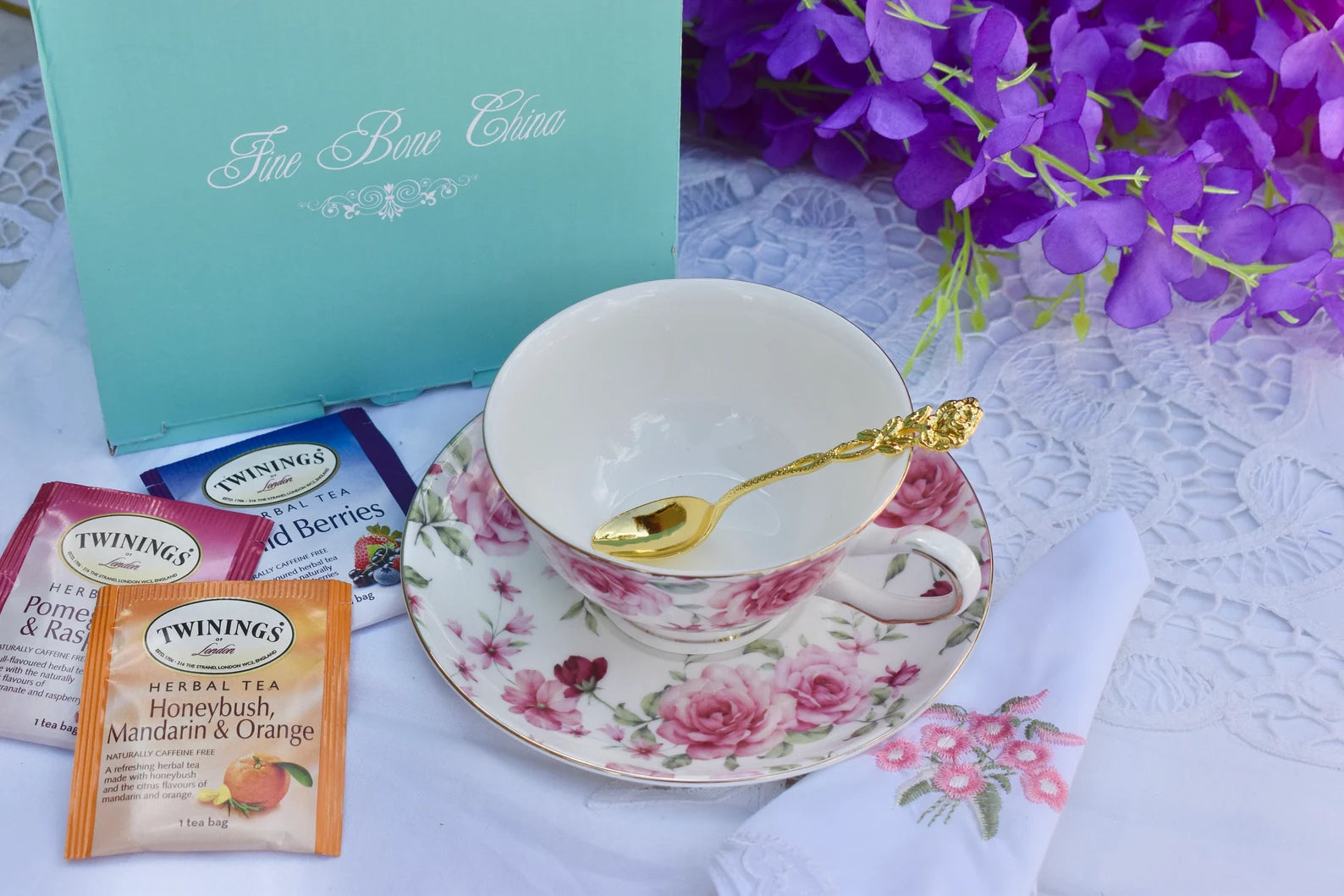 This complete gift set includes a teaspoon, linen tea napkin, and premium tea packet—everything needed for an instant, elegant tea experience. Arrives beautifully packaged in a presentation box, making it an ideal gift for tea lovers who appreciate classic, romantic style.