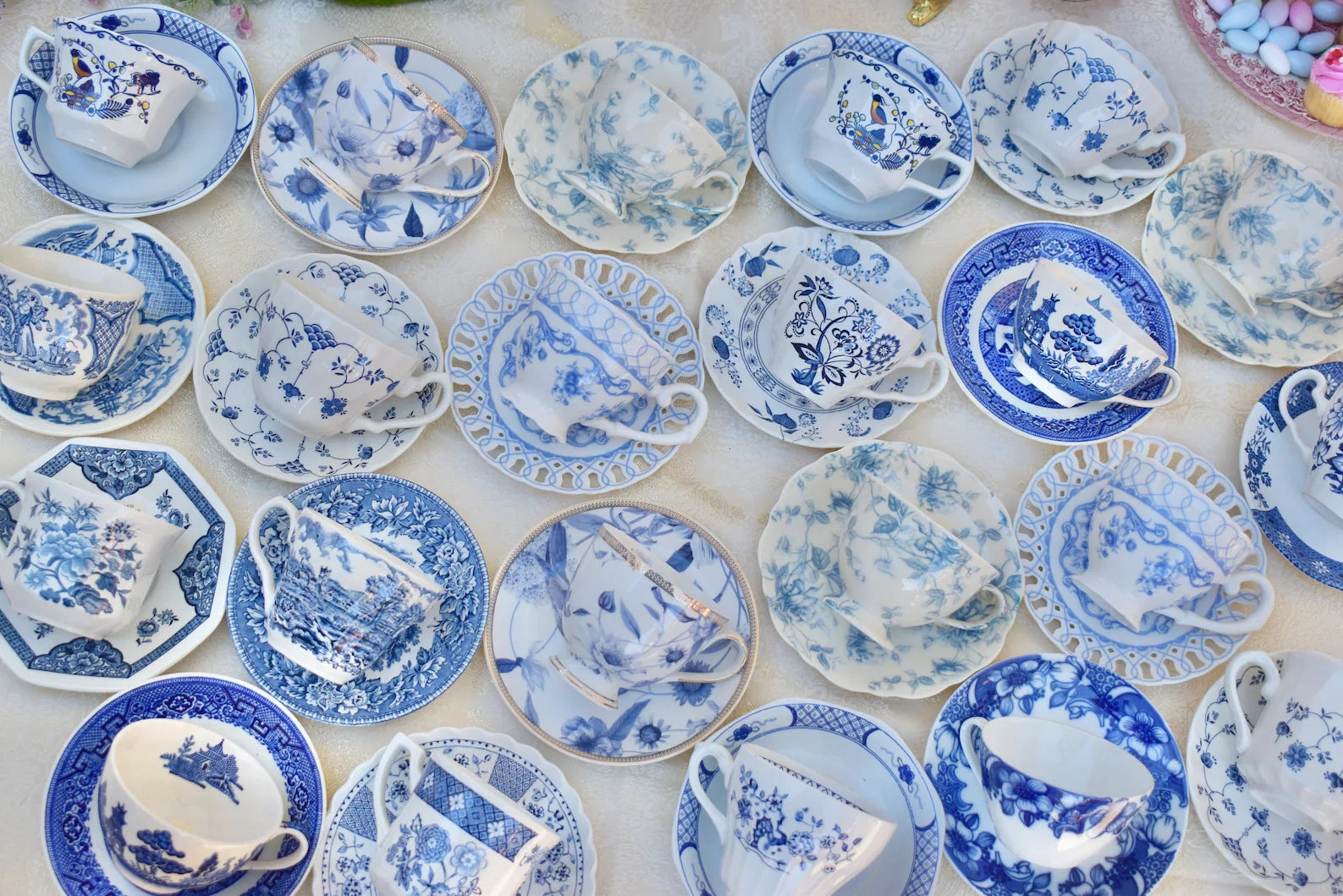 Each order is created with an assortment of brand new, fine bone china and porcelain cups and saucers, in mismatched combination of Blue and White designs, offering an instant regal experience. Perfect for creating an elegant and sophisticated look!