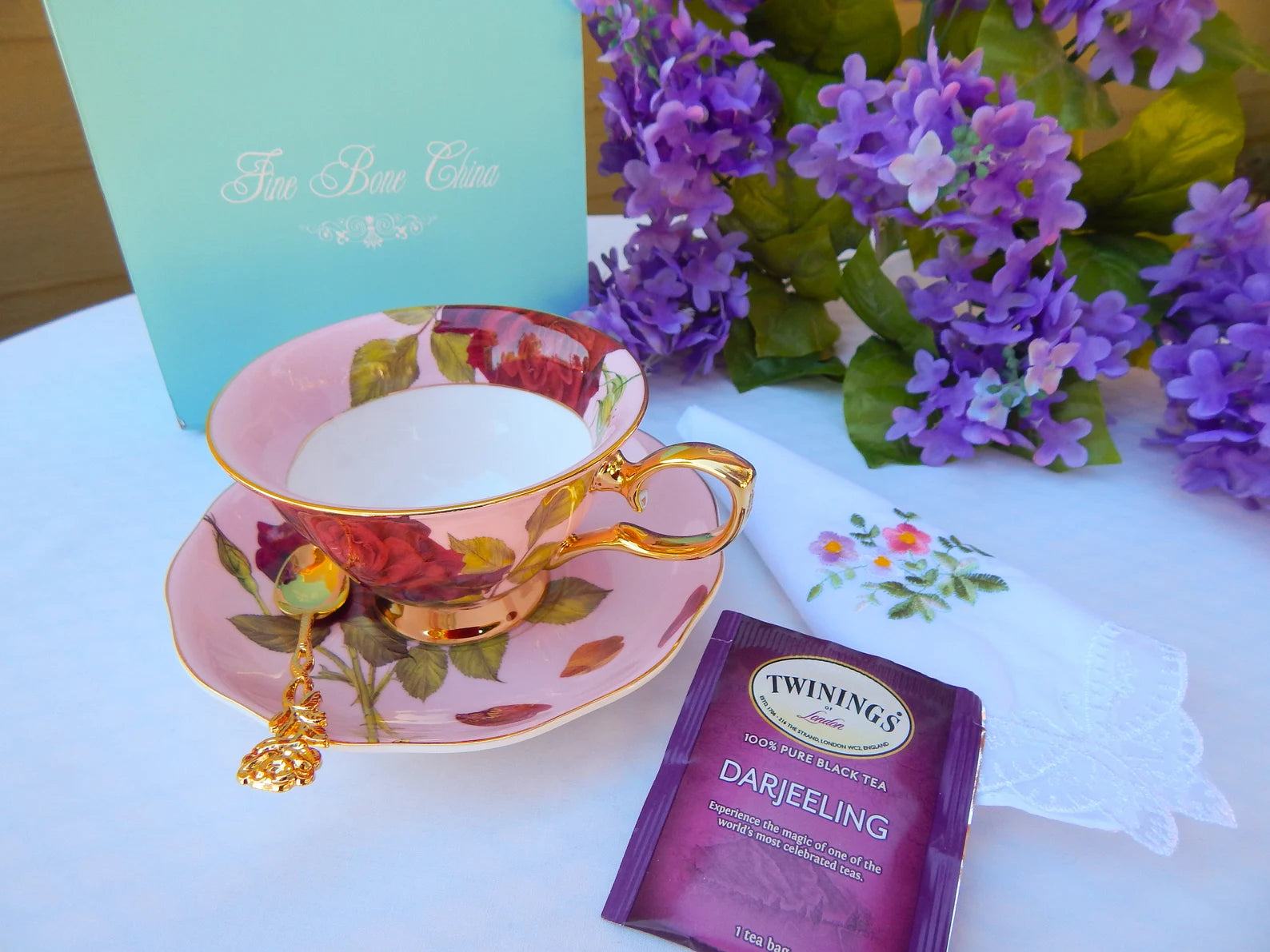 - Set Includes: Teacup, Saucer, Teaspoon, Linen Napkin, Tea Packet, Gift Box